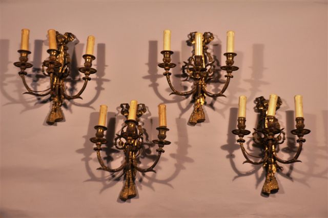 Suite de QUATRE APPLIQUES à trois bras de lumière en bronze et laiton doré. La platine à noeud de ruban et passementerie. Style Louis XVI. Haut. 35, Larg. 26 cm.