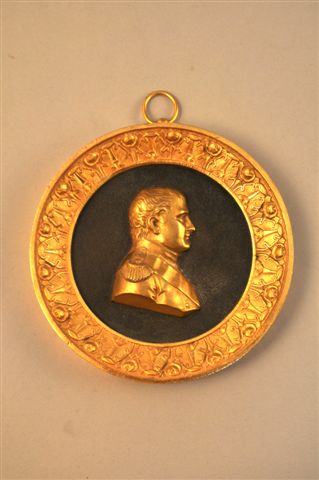 Médaillon BAS RELIEF "Profil de Napoléon" en bronze ciselé et doré, sur fond amati à patine médaille. Entourage à frise feuilles et de fleurs stylisés.