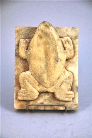 BATRACIEN en marbre sculpté, la bouche ouverte formant une encoche. Rapporté sur terrasse en marbre. Haut. 5, Long. 20, Larg. 14 cm (éclats à la terrasse)