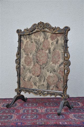 ECRAN de CHEMINEE en bois laqué noir et or, mouluré et sculpté. Les pieds mouvementés, les montants ajourés sculptés de volutes et coquilles. Rosace épaulée de feuilles d'acanthe sur la traverse supérieure. Feuille mobile. Haut. 107, Larg. 78, Prof. 42 cm.