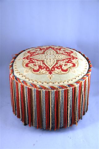 POUF circulaire sur roulettes garnies d'une tapisserie à motifs floraux géométriques et de franges multicolores.