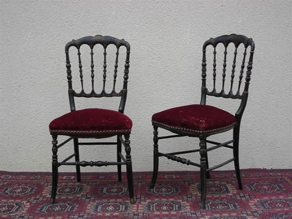 PAIRE de CHAISES en bois noirci, décor floral peint or, le dossier à fuseaux. Napoléon III. Haut. 88, Larg. 43, Prof. 39 cm.