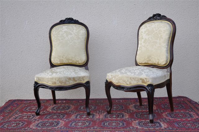 PAIRE de CHAISES à dossier plat en palissandre mouluré et placage de palissandre. Pieds antérieur cambrés, traverses et dossier mouvementé. Le haut du dossier sculpté de fleurs. Napoléon III. Haut. 92,5, Larg, 53, Prof. 48,5 cm.
