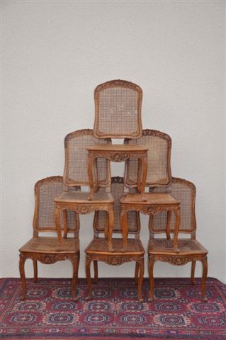 Suite de SIX CHAISES cannées en bois teinté mouluré et sculpté de rinceaux et fleurettes. Style Régence. Haut. 97, Larg. 50, Prof. 45 cm (une assise et un dossier à cannage accidenté)