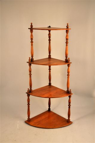 ÉTAGERE d'ANGLE en acajou blond bois teinté à quatre niveaux. Montants tournés. Haut. 79, Coté: 28 cm.
