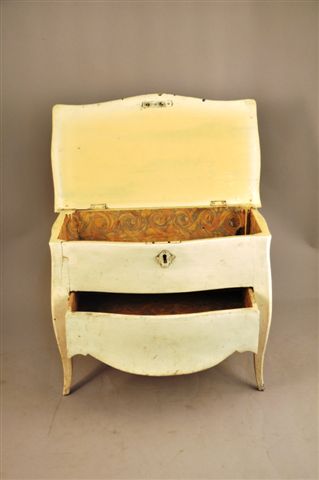 Modèle réduit de COMMODE en bois relaqué blanc, galbée sur trois faces, le dessus à abattant formant coffret, ouvrant à un tiroir .