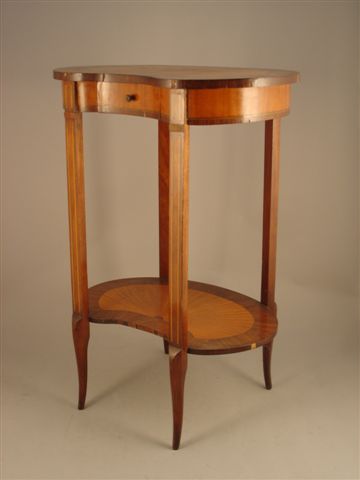 TABLE de salon dîte "rognon" en bois de placage teinté, ouvrant à un tiroir en ceinture, la plateau et l'entretoise à décor marqueté rayonnant.