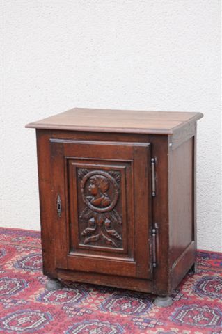MEUBLE BAS en chêne mouluré ouvrant à un vantail en façade. Il repose sur quatre pieds en demi -sphère. Décor sculpté de motifs végétaux et d'un médaillon au profil d'un jeune garçon, dans un entourage de feuilles de lauriers.