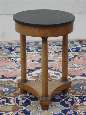 GUÉRIDON en placage de loupe d'orme. Il repose sur trois pieds boules. Pieds en colonne dorique renflée réunis par une entrejambe, bagués de laiton. Dessus de marbre granité belge. Style Empire. XIXème. Haut. 73, Diam. 50 cm.