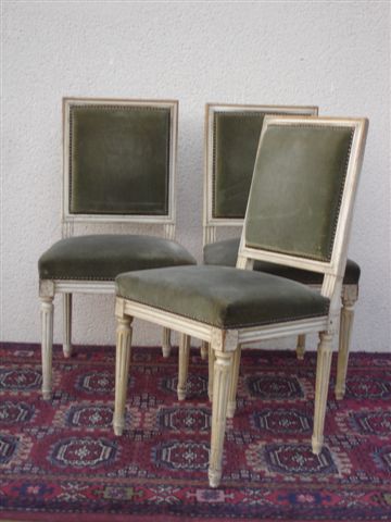 SUITE de TROIS CHAISES en bois mouluré laqué blanc. à dossier plat. Pieds antérieurs cannelés, fuselés et rudentés. Style Louis XVI. Haut. 90, Larg. 47, Long. 44 cm.