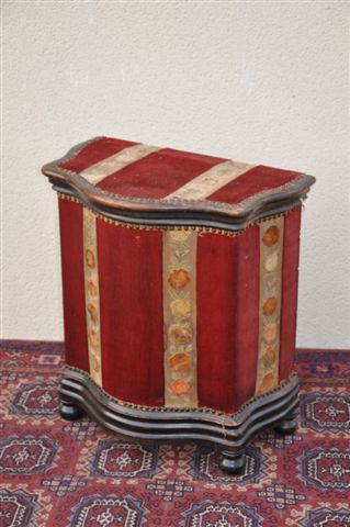 COFFRE à BOIS en bois mouluré noirci, de forme galbée sur trois faces, reposant sur quatre pieds boule. Garni de velours bordeaux, appliqué de bandes partiellement brodées.
