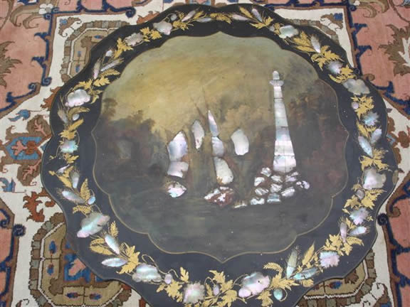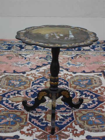 GUÉRIDON tripode en bois noirci. Fût tourné et pieds mouvementés. Plateau basculant polylobé, à décor peint et incrusté de nacre d'un pahre et de voiliers, frise florale en périphérie. Napoléon III. Haut.76, Diam. 65 cm (petits accidents)