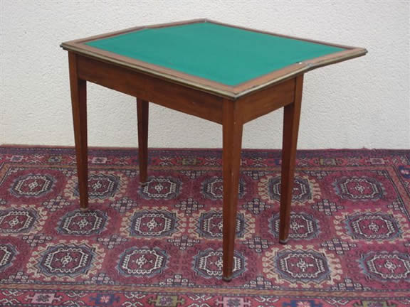 TABLE à JEU rectangulaire en acajou et placage d'acajou. Le plateau garni de feutre vert s'ouvre pour reposer sur un tiroir à coulisses retenu par deux pieds. XIXème siècle.