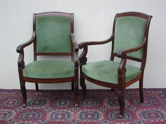 PAIRE de FAUTEUILS en acajou à dossiers renversé, accotoirs à crosse, piètement antérieur en jarret et le piètement postérieur sabre.