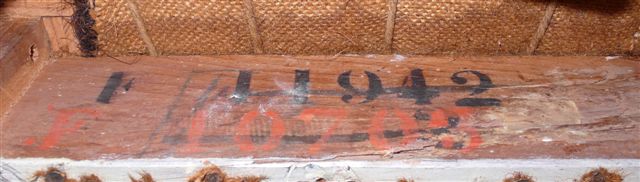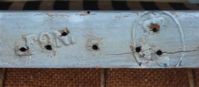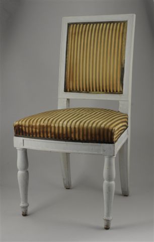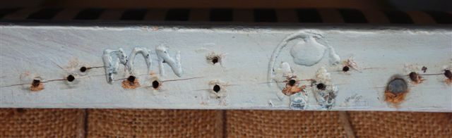 Pour la seconde chaise: N° au pochoir en noir "F 11 942 " rayé et "[double] F 7089", et en rouge "F 10705" et "385" (travaux de vers).