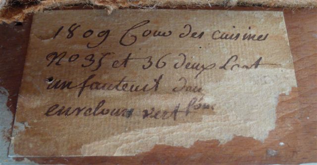 Pour la première chaise: Etiquette manuscrite "1809 Cour des cuisines n°35 et 36 deux...un fauteuil deux en velours vert...". N° au pochoir en noir "15 885 2" et " [double] F 8100", et en rouge "38 F 2660"