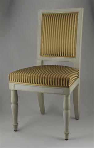 Paire de CHAISES en bois mouluré et relaqué gris. Pieds antérieurs dits "Jacob". Pieds postérieurs en sabre. Dossier plat légèrement renversé. Traverse antérieure légèrement galbée.