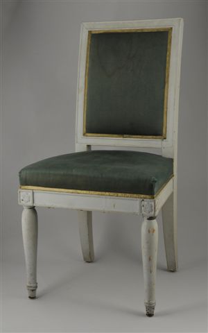Paire de CHAISES en bois mouluré et relaqué gris. Pieds antérieurs fuselés de section ronde. Pieds postérieurs en sabre. Dés de raccordement sculpté de fleurs stylisées. Dossier plat légèrement renversé. Traverses droites.