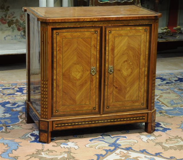 MEUBLE d'ENTRE-DEUX en placage de bois de rose, palissandre et acajou, ouvrant à deux vantaux. Les montants antérieurs à pans et postérieurs marquetés de fausses cannelures à asperges. Les vantaux marquetés au centre de médaillon.