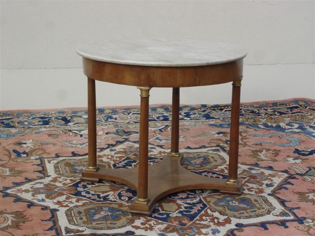 GUÉRIDON en bois de placage reposant sur quatre pieds en colonnes, à chapiteau dorique dorés, réunis par une entretoise losangique. Piètement à gradin, plateau en marbre blanc à champ arrondi.