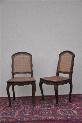 PAIRE de CHAISES cannées en bois naturel mouluré et sculpté, les pieds cambrés sculptés de feuilles d'acanthes, les traverses et le haut du dossier ornées de coquilles. Régence, XVIIIème. Haut. 93, Larg. 49, Prof. 43 cm. (restaurations, éléments postérieurs).