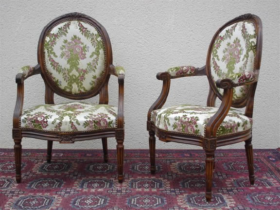 PAIRE de FAUTEUILS en bois teinté mouluré et sculpté. Dossier médaillon, pieds fuselés cannelés.