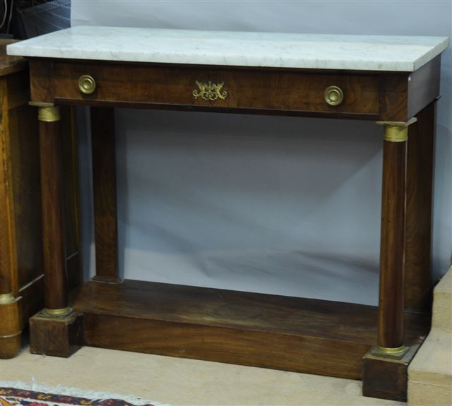 CONSOLE en placage d'acajou ouvrant à un tiroir, les montants antérieurs à colonne et postérieurs en pilastre, repose sur une plinthe. Dessus de marbre blanc. Empire. Haut. 92, Larg. 114,5, Prof. 47 cm.