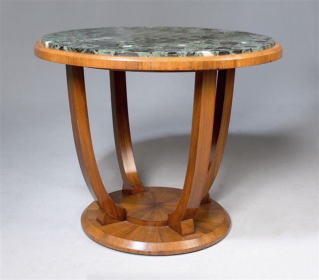 Jules LELEU (1883-1961). GUÉRIDON en placage de palissandre à plateau circulaire en marbre vert surmonté par quatre montants cintrés sur réception à gradin.
