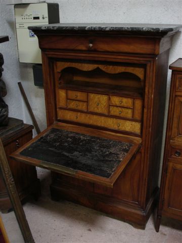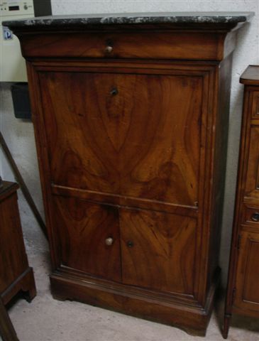 SECRÉTAIRE en bois de placage ouvrant à deux vantaux en partie basse, un tiroir en doucine et un abattant découvrant une case et six tiroirs en placage d'érable. Dessus de marbre gris Saint-Anne.