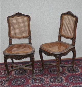 PAIRE de CHAISES cannées en bois mouluré et sculpté. Pieds galbés à entrejambe. Décor sculpté de feuilles d'acanthe.