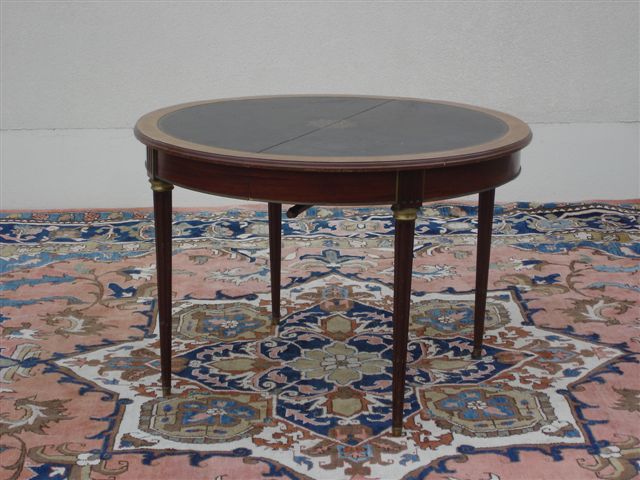TABLE ronde en placage d'acajou et bois teinté acajou, à allonges, reposant sur quatre pieds fuselés et cannelés, bagués de bronze. Plateau recouvert de cuir noir doré aux fers.