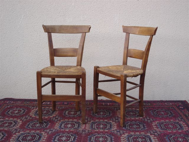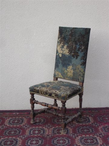 LOT de 3 CHAISES: PAIRE de CHAISES paillées en bois fruitier (Haut. 92, Larg. 34, Prof. 41,5 cm, accidents et manques). CHAISE à haut dossier en bois tourné à entrejambe en "H", style Louis XIII. Garnie de fragment de tapisserie d'Aubusson du XVIIème (Haut. 112, Larg. 44, Prof. 53 cm, usures)