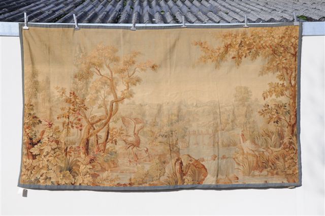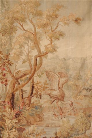 TAPISSERIE d'AUBUSSON représentant deux échassiers dans une perspective paysagée au château, sur fond de montagnes. Plantes au premier plan. Laine et soie.