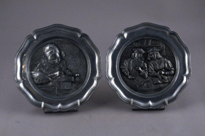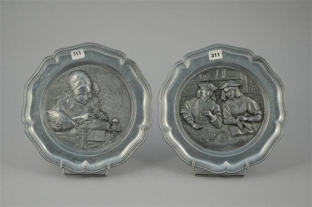 Paire d'ASSIETTES en étain à bords contournés, martellées au centre de reproduction de tableaux du Louvre: la "Dentelière" par Vermeer et les "Changeurs" par Metsys. Marque à l'ange.