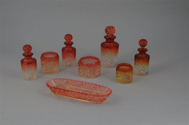 LOT de DEUX parties de GARNITURE DE TOILETTE 4 pièces en cristal moulé incolore et framboise en dégradé. Le premier à motifs tourbillonnants, comprenant une paire de flacons (Haut. 13,5), un pot de forme cylindrique, et un porte-brosse à dents. Modèle de BACCARAT. Le second à côtes torses, comprenant deux flacons (Haut. 17,5 et 14,5 cm) et deux pots de forme cylindrique. Fin XIXème (accidents et égrenures, un bouchon rapporté).