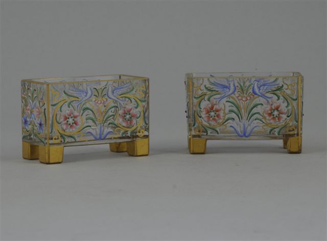 PAIRE de petites JARDINIÈRES rectangulaires en verre, reposant sur quatre pieds cubiques dorés. Décor polychrome émaillé en relief et or, toutes faces, d'oiseaux et de rinceaux fleuris, application de perles d'émail grenadine.