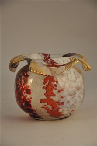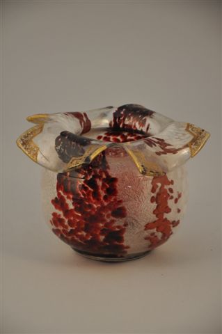 VASE de forme boule en verre soufflé et gravé de motifs végétaux, le col déchiqueté travaillé à la pince formant une croix , irisé en rouge et en blanc, décor de rinceaux fleuris dorés sur les angles. Haut. 13,5, Diam. 16,5 cm. (éclats)