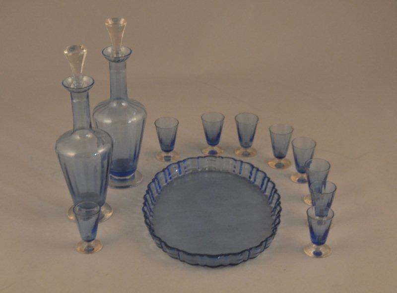 SERVICE À LIQUEUR en verre teinté bleu et blanc comprenant un plateau ovale à bord mouvementé, deux carafes fuseau sur pied et leur bouchon, neuf petit gobelets sur pied.