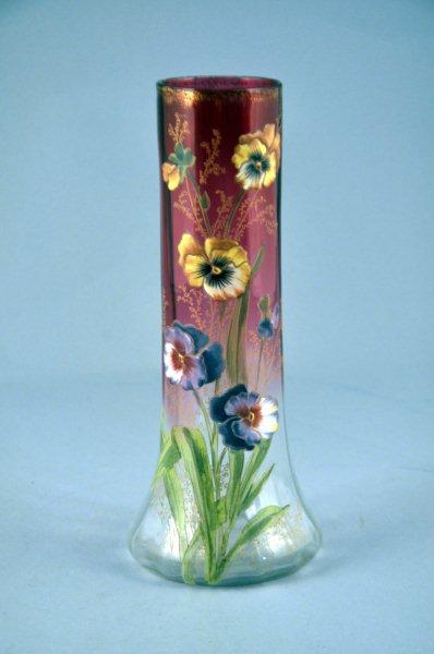 VASE en verre blanc et rouge, à décor émaillé polychrome de fleurs sauvages, rehauts d'or. Signé "&" et "18".