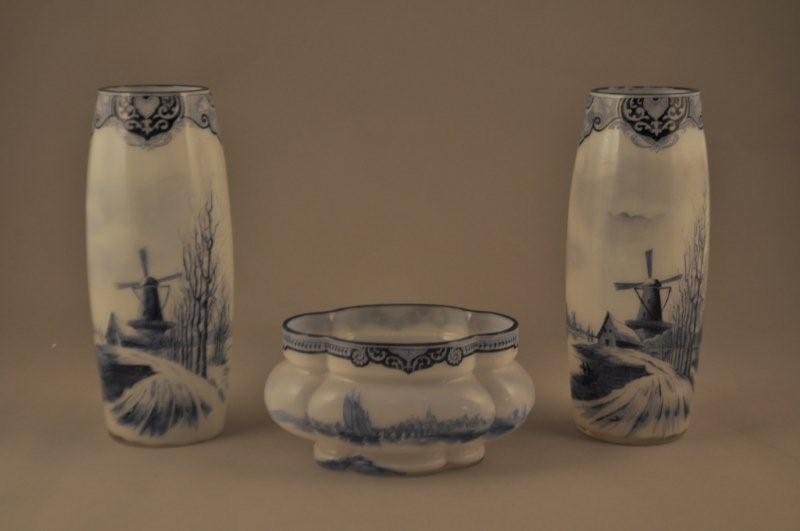 GARNITURE "AUX MOULINS" en verre opalin composée de deux vases cylindriques et d'une jardinière polylobée, à décor en camaïeu de bleu de moulins et de pont au bord d'un fleuve (La Loire?) dans le goût hollandais.