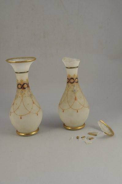 PAIRE de VASES en verre opalin blanc avec des applications d'émaux polychromes et or. Décor d'arabesques et de perles dans le goût persan. Première moitié du XIXème siècle. Haut. 30 cm. (accident)