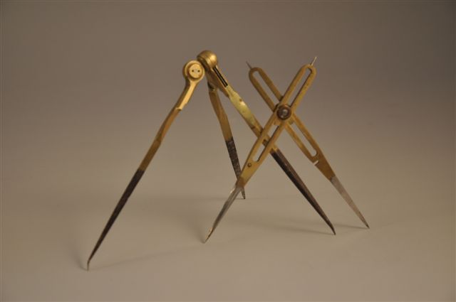 DEUX COMPAS en laiton et acier. Le premier de réduction et le second à trois pointes. XVIIIème. Long. repliée respectives: 16,5 et 17 cm (choc aux pointes du second)