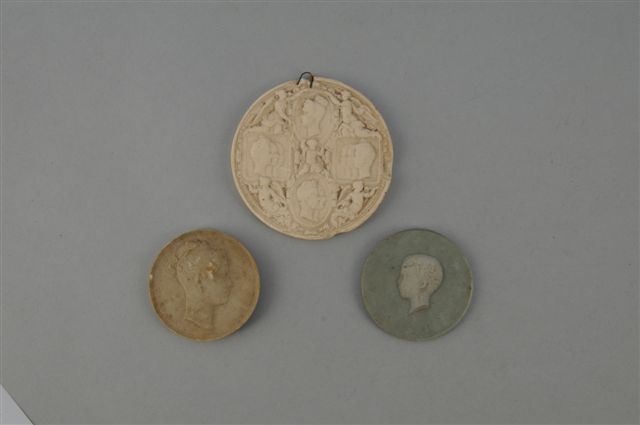 MÉDAILLE en plâtre teinté, présentant 9 profils dans quatre réserves dont Louise Marie Adélaïde Eugénie d'Orléans (1777-1847) dîte Madame Adélaïde, et Louise-Marie d'Orléans, épouse du roi Léopold Ier de Belgique. Diam. 75 mm.