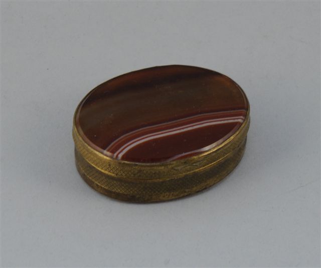 BOITE ovale en sardoine, fond et couvercle enserré dans une monture en métal doré à motifs de croisillons. XIXème. Haut. 2, Long. 6, Larg. 5 cm