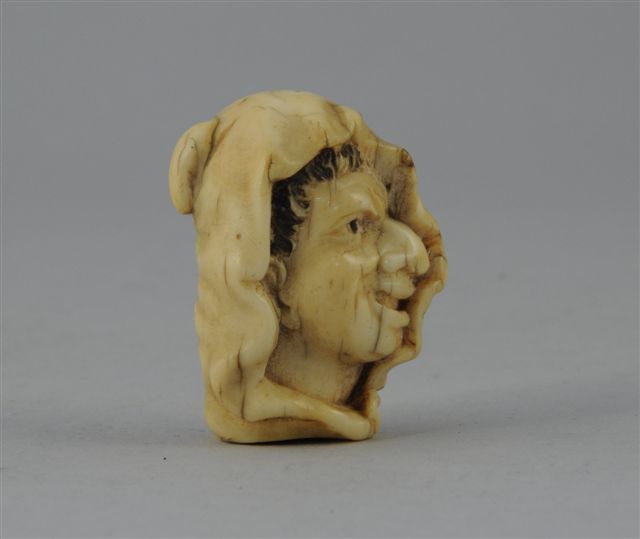 POMMEAU de CANNE en ivoire sculpté figurant une tête encapuchonnée, couverte sur un profil, allégorie de la nature humaine (?). Haut. 4,5 cm.