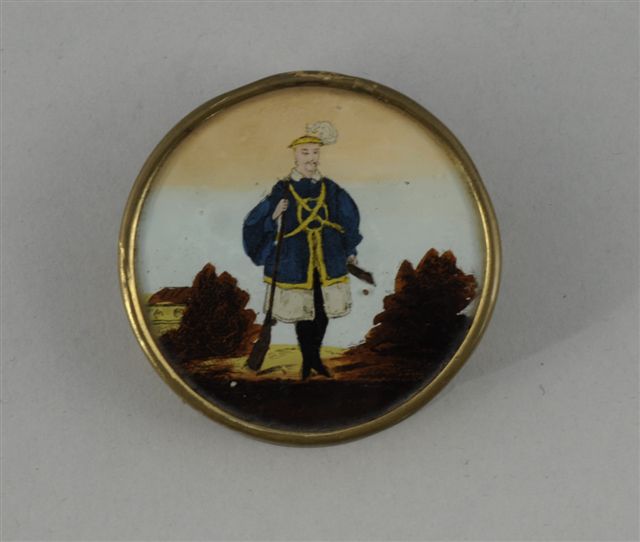 BOITE à confiserie en cartonnage cerclé de laiton doré à frise de volutes feuillagée, le couvercle en fixé sous verre à décor d'un chinois tenant une arme à feu. XIXème. Diam. 6,5 cm.