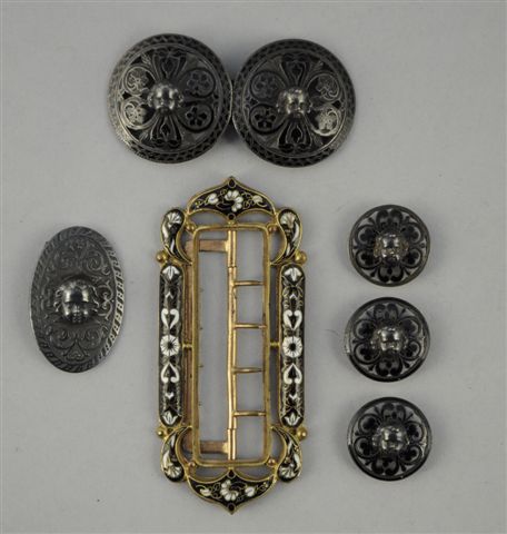 LOT composé d'un ensemble de trois BOUTONS, une BOUCLE double de CAPE en argent. De forme circulaire, ajouré de volutes végétales émaillées noir, centrées d'une tête de chérubin en bas relief. Poinçon Tête de sanglier (Joint: élément de BOUCLE de CAPE ovale, d'un modèle très proche). BOUCLE de CEINTURE en métal doré émaillée en noir et blanc de bleuets et motifs stylisés.