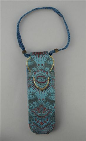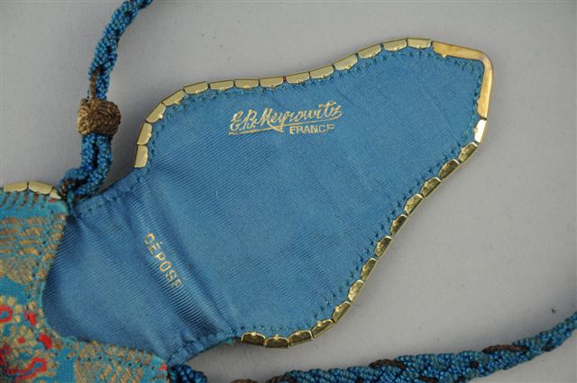 ETUI-POCHETTE de soirée en tissu broché or et rouge à fond turquoise, à motifs de cerfs affrontés. Miroir à biseau. Maison MEYROVITZ. 19 x 6 cm