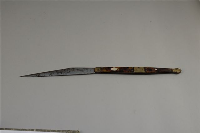 GRAND COUTEAU PLIANT manche en écaille, incrustration de nacre et monture en laiton. La lame marquée "COUT A RET". XIXème. Long. 44 cm. (piqûres sur la lame)