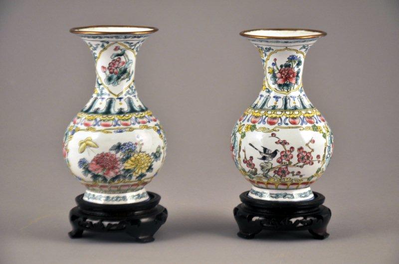 Paire de VASES PANSUS À COLS ÉVASÉS en émail, à décor polychrome peint de bouquets, d'oiseaux et d'insectes dans des cartouches fleuris sur une réserve blanche.